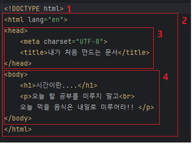 | 1. 현재 페이지는 HTML5 언어로 된 문서라는 내용 2. <html> ~ </html> : 웹 문서의 시작과 끝을 표현하는 태그 3. <head> ~ </head> : 웹 문서의 분석을 위한 내용을 적는 부분. 여기에 적는 내용은 실제 브라우저에는 표시가 되지 않으며, 스타일과 스크립트가 포함되기도 함 4. <body> ~ </body> : 실제 웹 브라우저 화면에 표시될 내용을 적는 부분. 대부분의 태그는 여기에 적어주게 됨 |