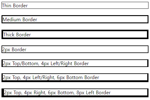 예제는 border-width 속성을 사용하여 다양한 테두리 두께를 적용한 HTML 요소들을 보여줍니다. 이를 통해 각각의 설정이 어떻게 보이는지 확인할 수 있습니다.